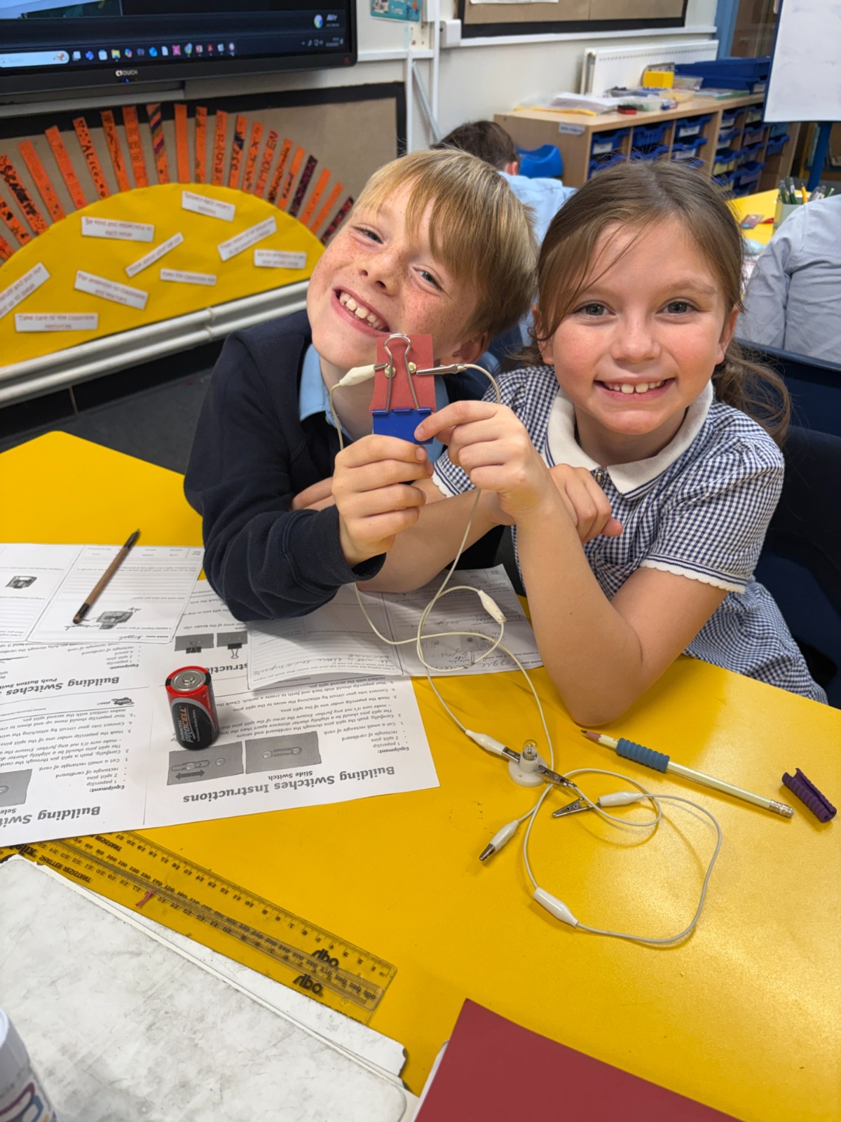 In science, the children used their knowledge of conductors and insulators to make their very own switches using card and different types of pins/clips. They thought carefully about their design and demonstrated how they could open and close their switches to control the flow of electricity. They checked that they were fit for purpose by using the equipment to make complete circuits.