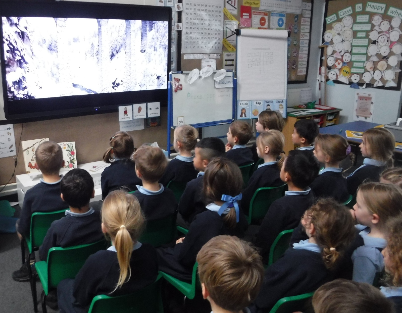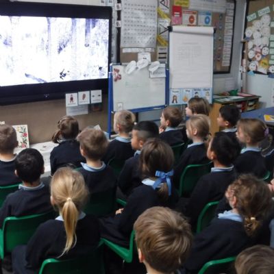 In English lessons, the children took part in an immersive experience to inspire their writing; they set out their chairs, so they were like a train carriage, and watched a film of the glacier express travelling through the Alps. The recent cold weather also helped them to describe the icy scenery and how it would feel waiting for the train on a freezing platform. During their art lesson, the children used free expression to create an image of a steam train in a wintery landscape of frozen mountains, rivers and forests. They used black paper for a background and took great care applying chalk and pastel to represent the scene.